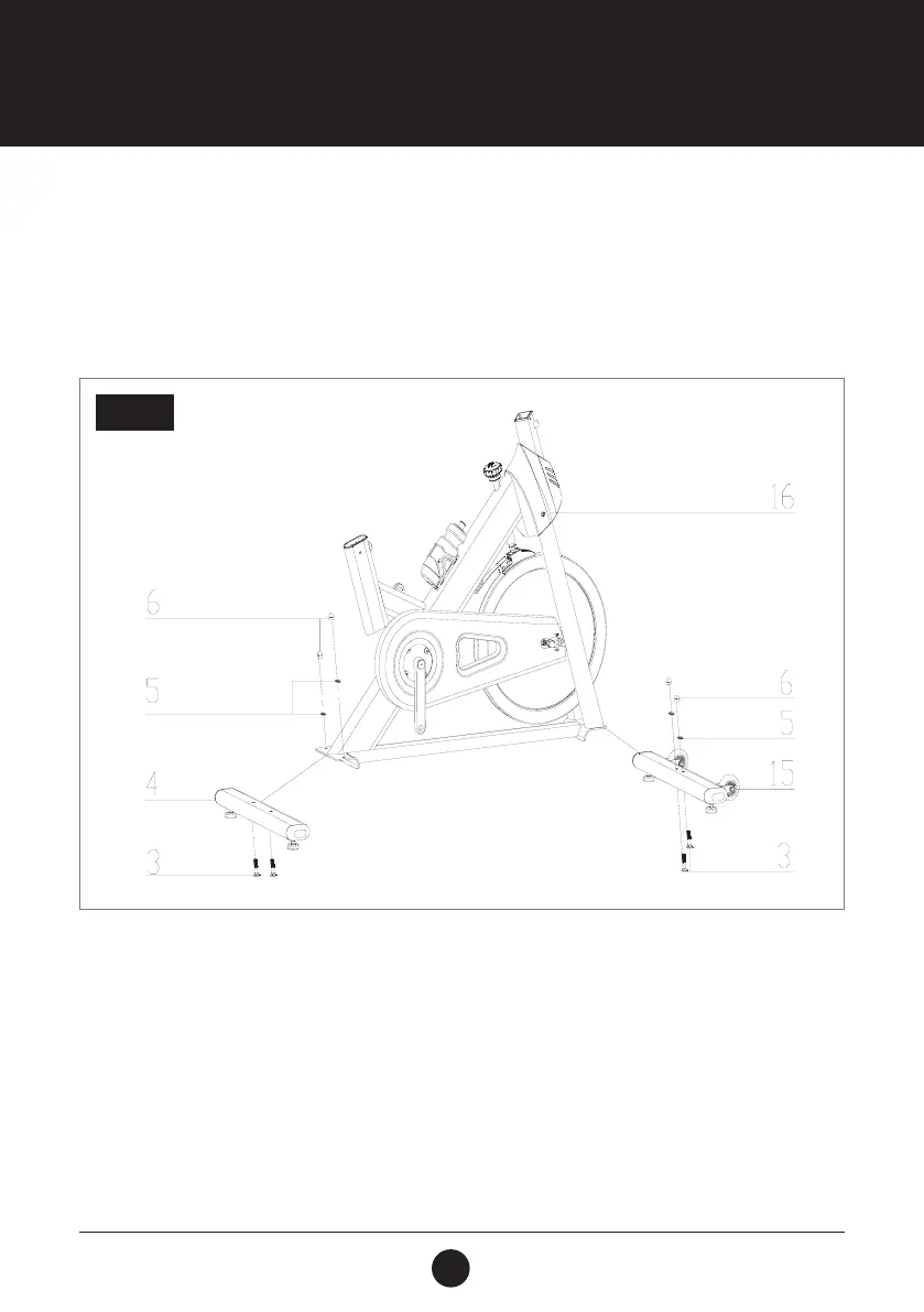 Attach the Front Stabiliser (15) to the Main Frame (16) using 2 sets of Flat Washers (GB / T 95 - 2002 8 mm) (5),