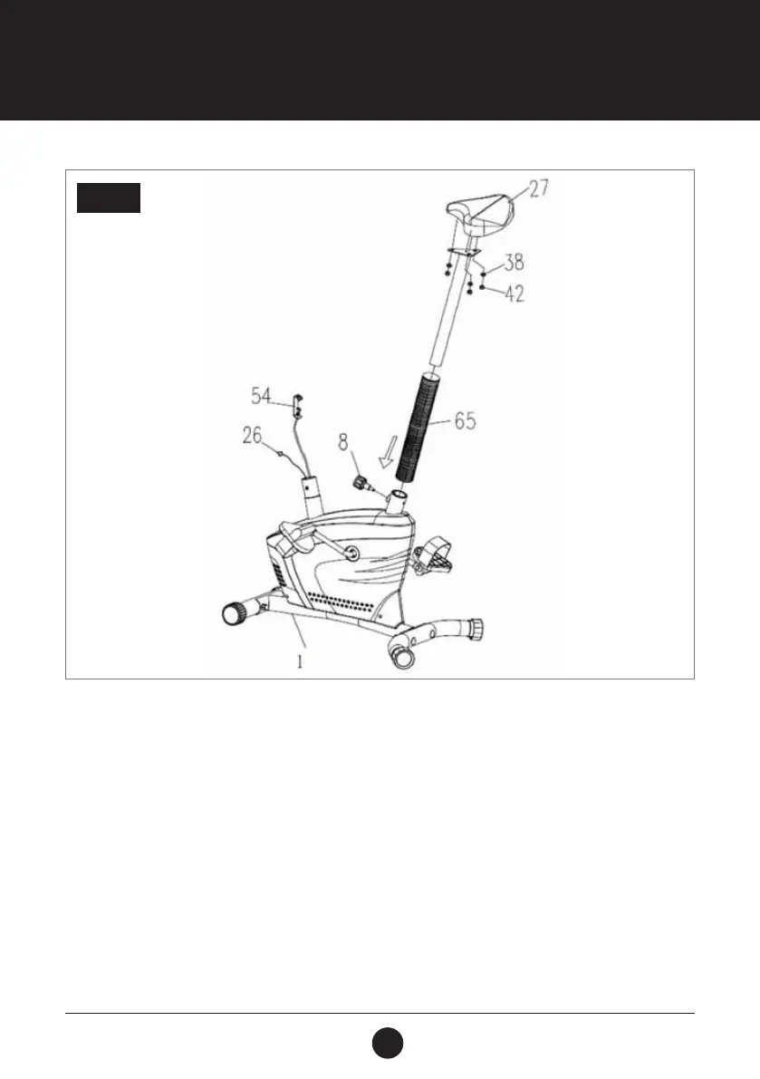 Insert the Seat Post (25) with the Plastic Sleeve (65) into the bushing on the tube of the Main Frame (1) and then attach the