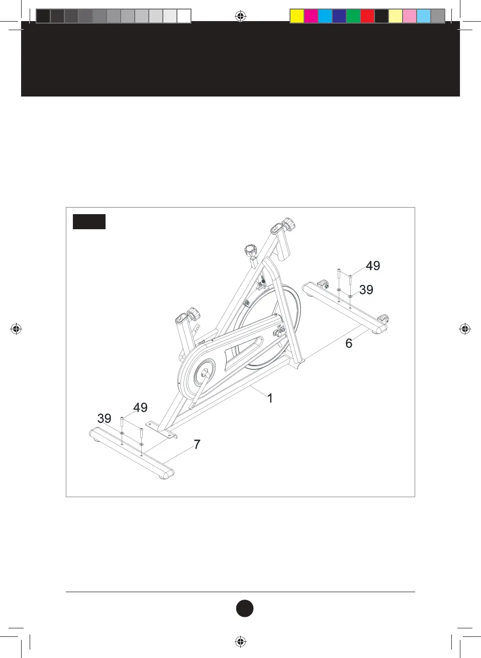 Attach the Front Stabiliser (6) and Rear Stabiliser (7) to the Main Frame (1) using 4 Screws (M8 X 40 X 20) (49)