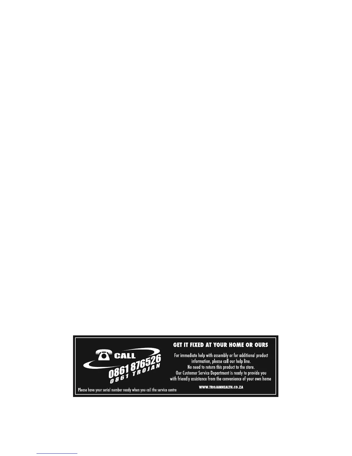 • Call 0861 Trojan (0861 876526) to log the faulty product (under warranty or out of warranty)