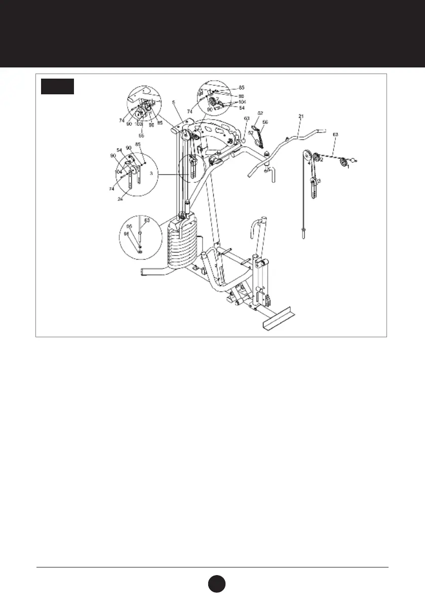 With the Upper Cable (63) in the groove of the Pulley (54), install Pulley (3) and 2 Pulley Brackets (104) into the