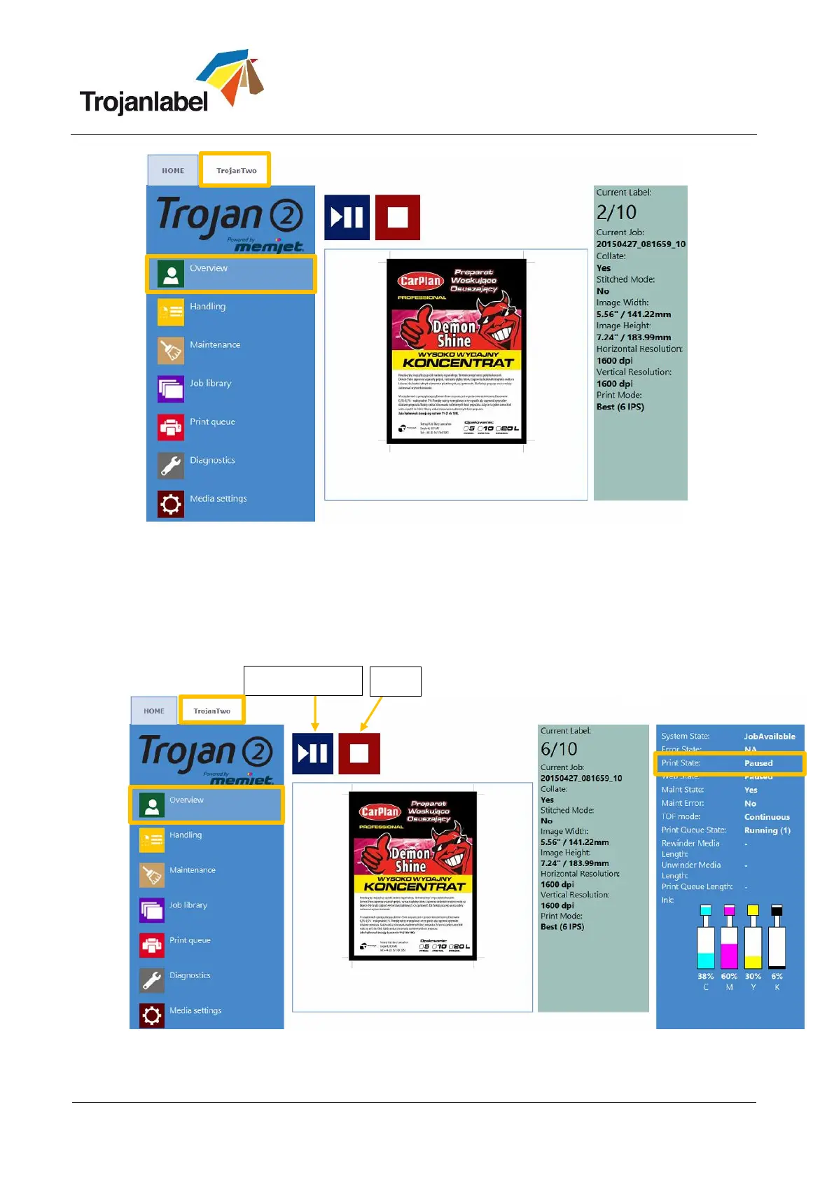 Pause, resume and stop of print job is done from the TrojanTwo tab/Overview menu.