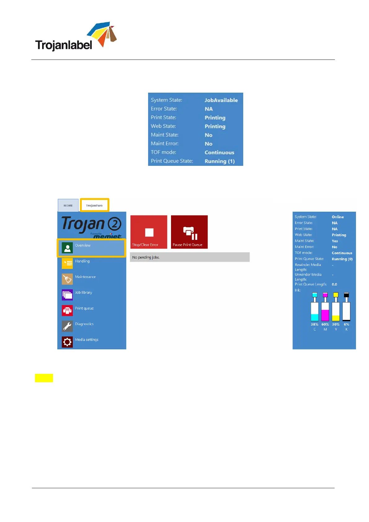 Stop: Press the button. Print state will change to “NA” and current print job is canceled and