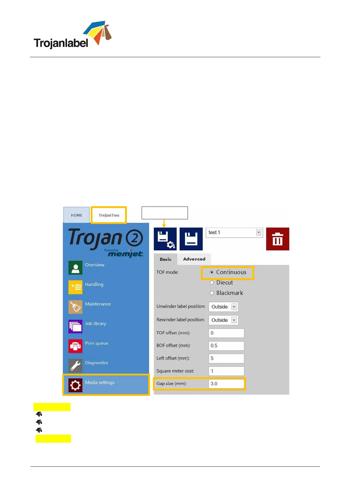 To select continuous printing mode go to TrojanTwo -> Media Settings menu and choose