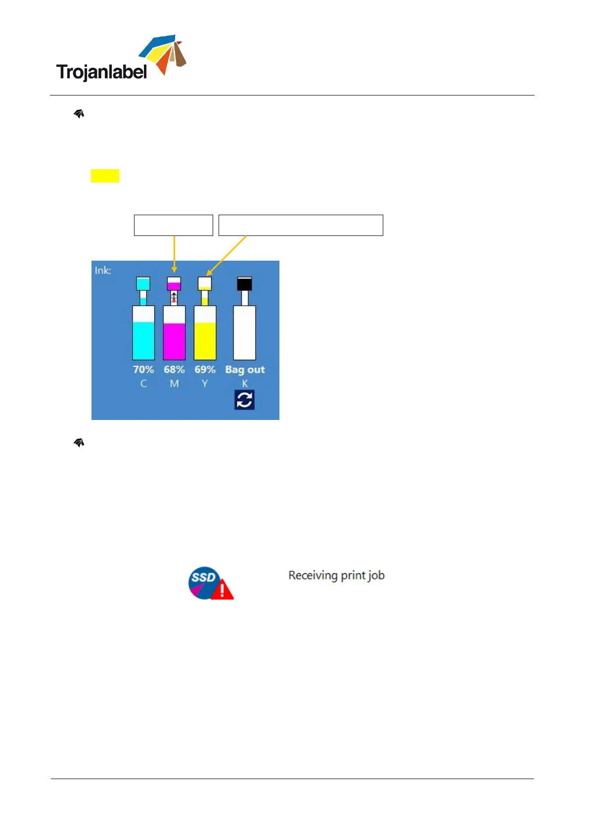 When a crossed out arrow appears in status bar. This means that pump cannot bring the ink up