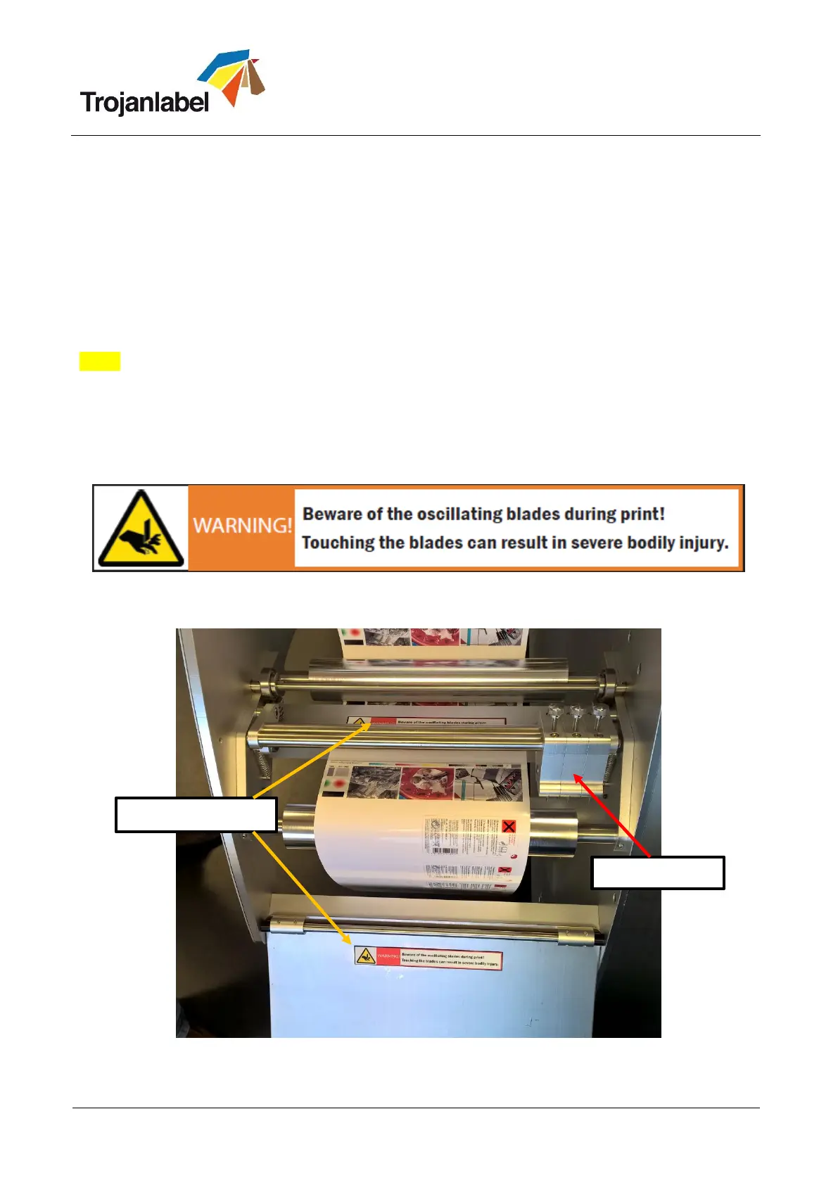 There are two warning signs need to be put on to the TrojanTwo press when the slitter is installed: