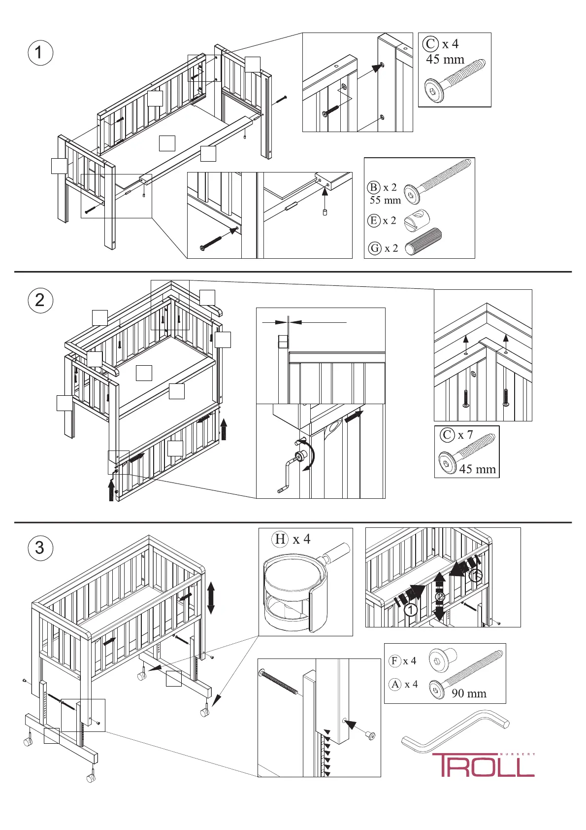TROLL nursery Bedside Crib - Assembly Instructions; Step 1: Attach Side Panels and Base; Step 2: Attach Back Panel; Step 3: Attach Legs and Wheels