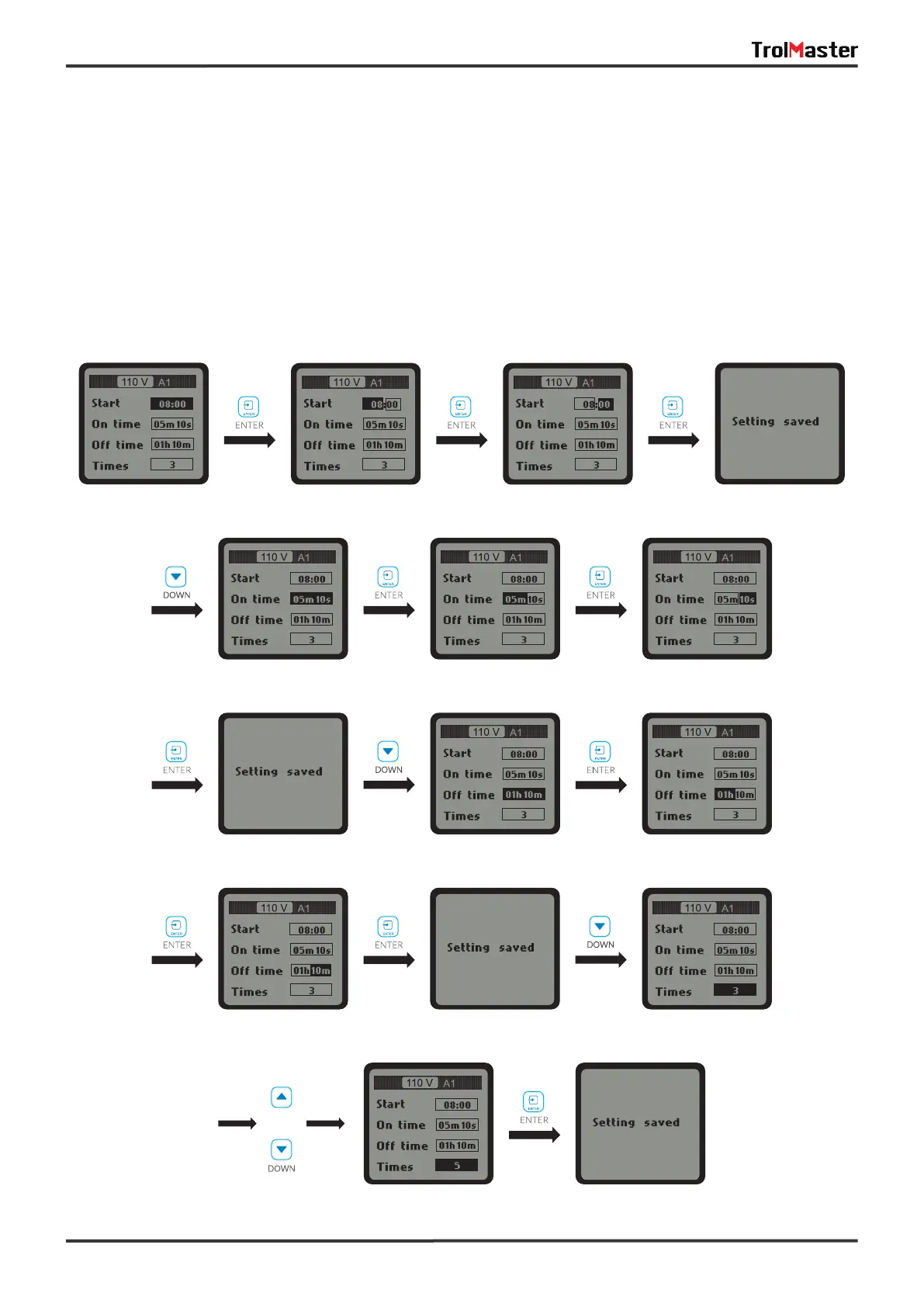 & “Times" for change. Press ENTER button to activate the setting. For example, when “Start” is selected,