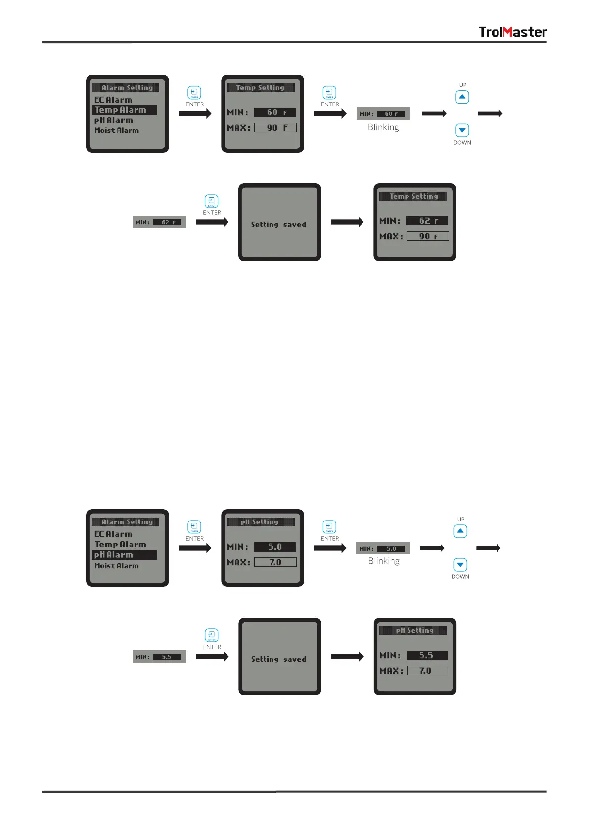 When the pH Alarm is selected, press the ENTER button to enter the pH Alarm setting page. The LCD screen