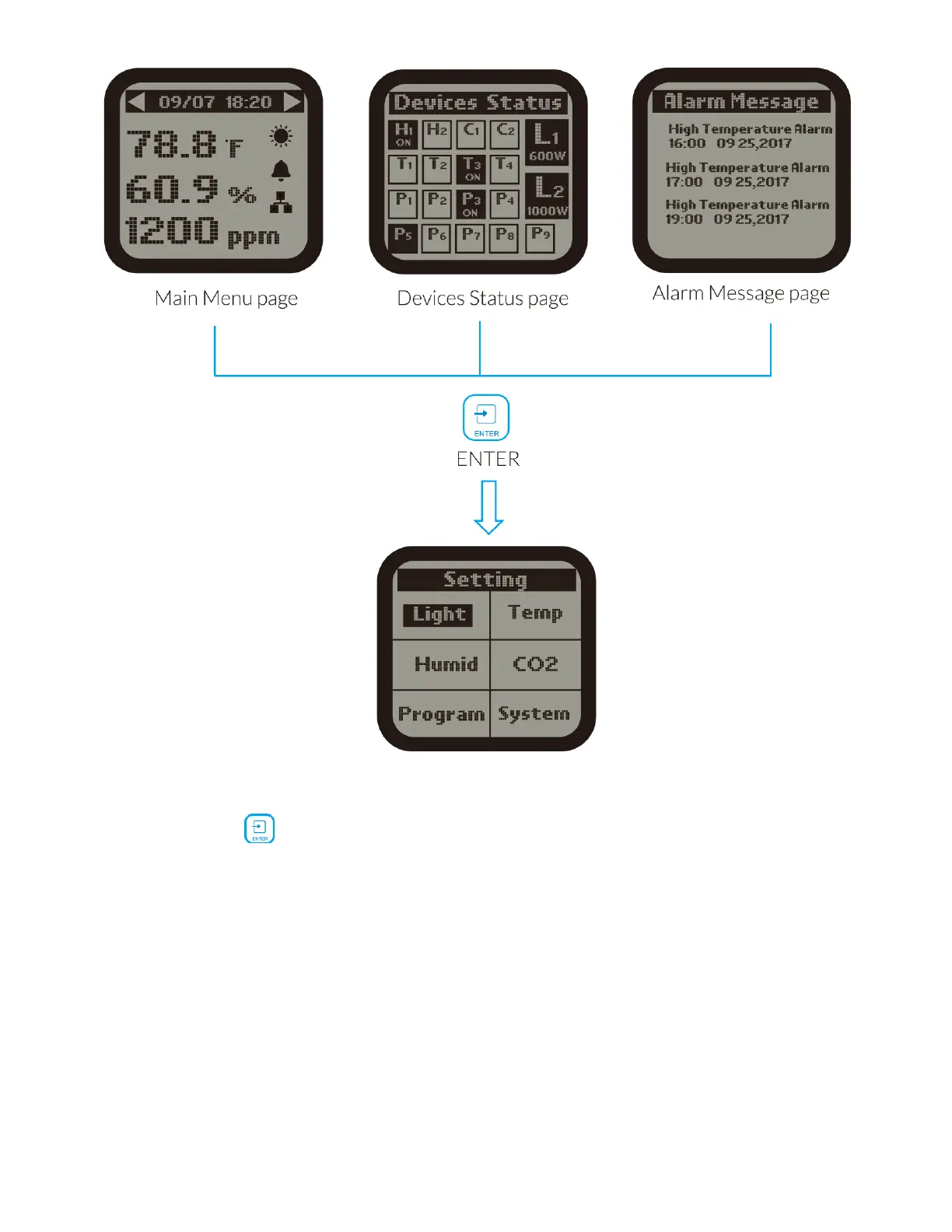 display 6 subjects ( Light / Temp / Humid / CO2 / Program / System) as shown