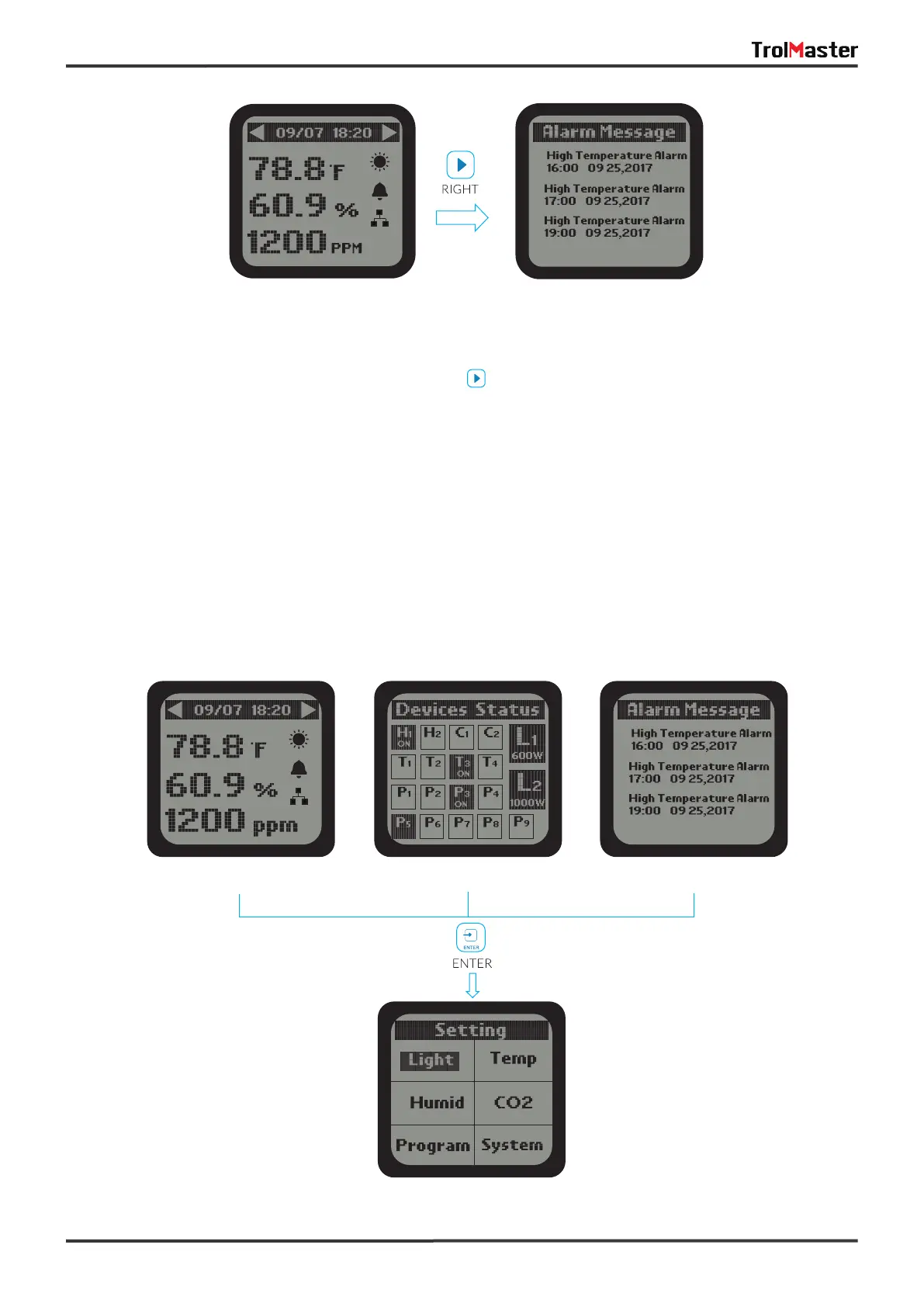 3). On the Main Menu page, press the RlGHT button to get access to Alarm Message page. The LCD
