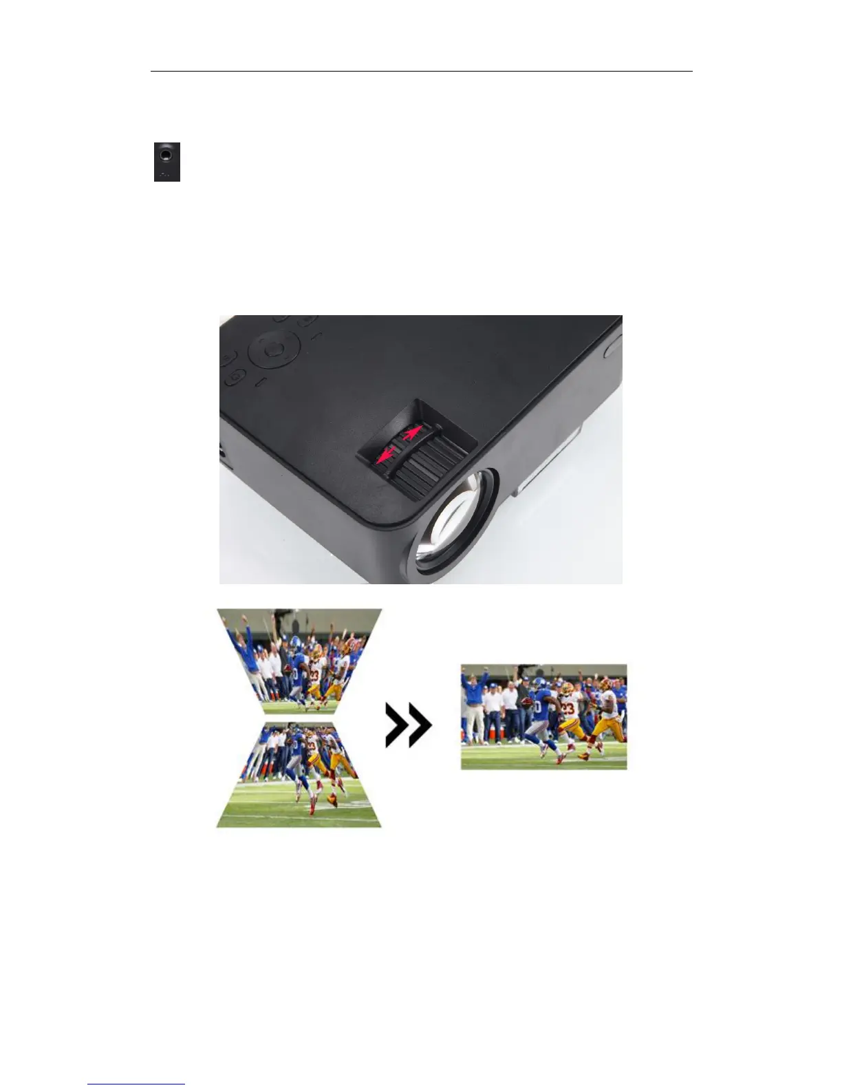 Image focus: place the projector vertical to the projection screen, and then turn the focusing ring