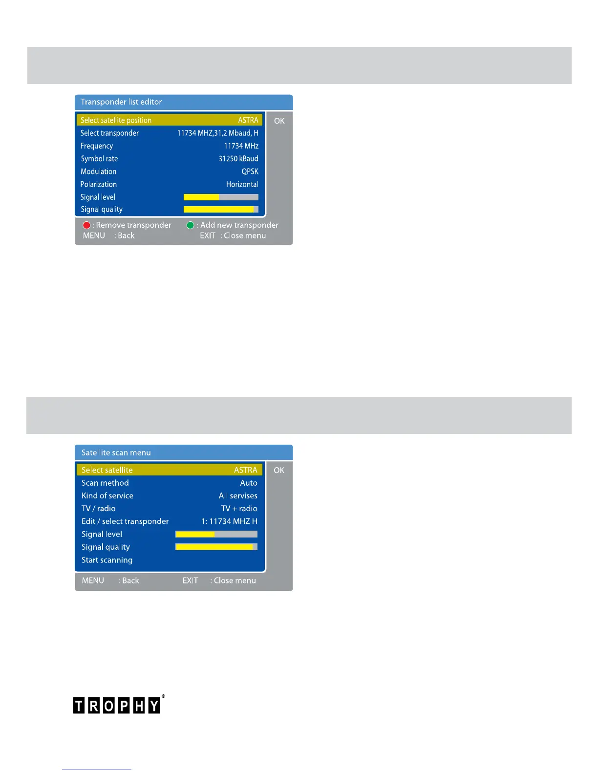 Two scales at the bottom indicate the level and quality of the signal on each transponder. Now