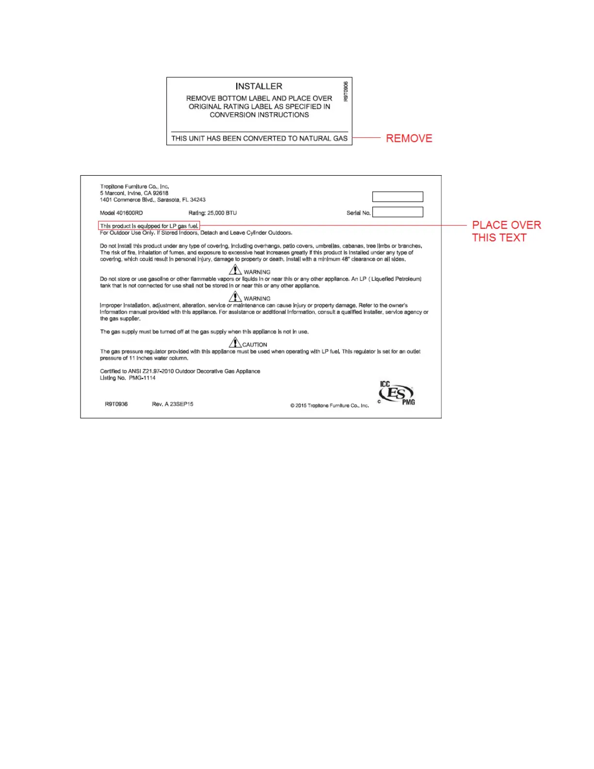 Once your Fire Pit has been converted to Natural Gas, please locate the small silver label and
