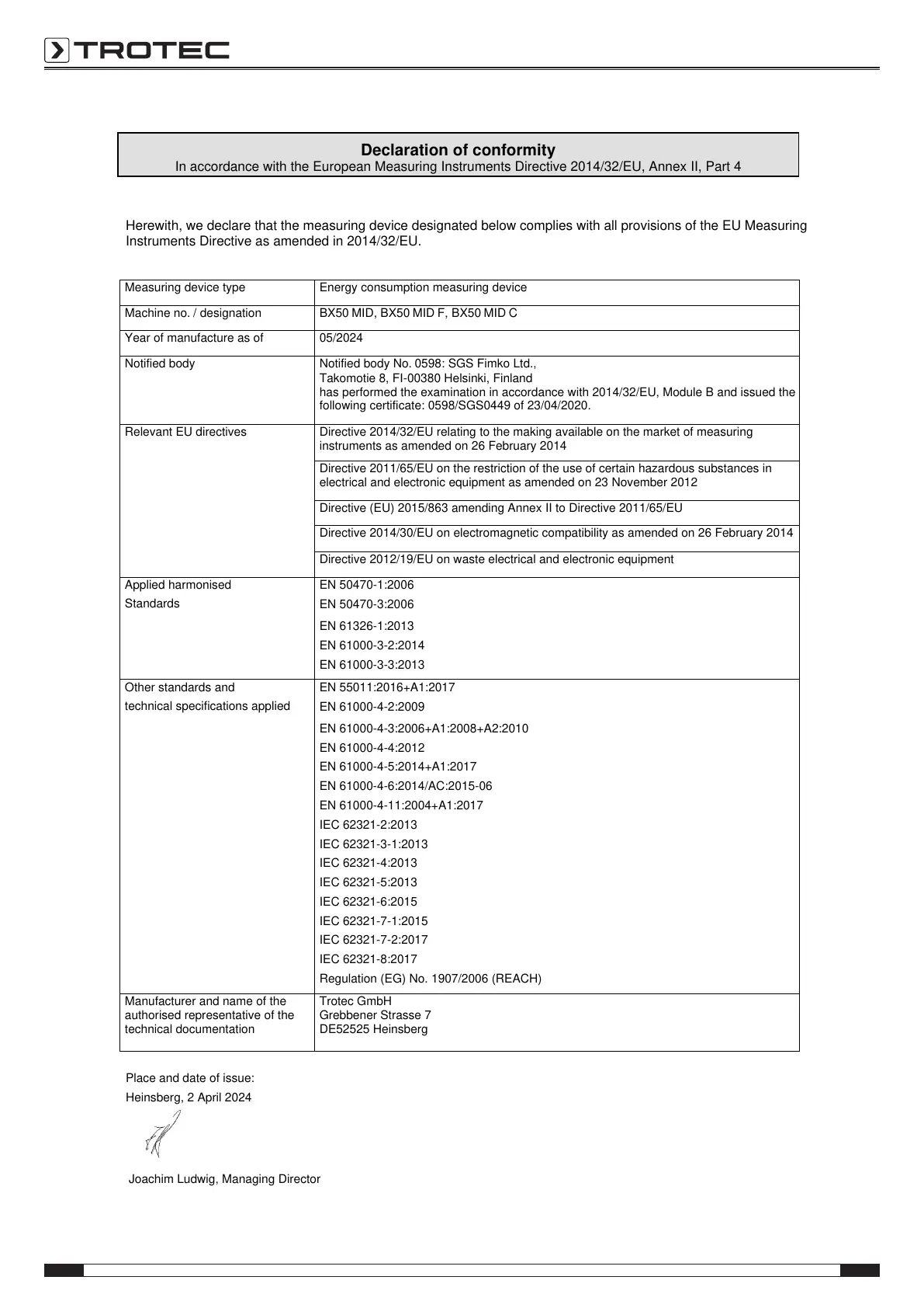 In accordance with the European Measuring Instruments Directive 2014/32/EU, Annex II, Part 4