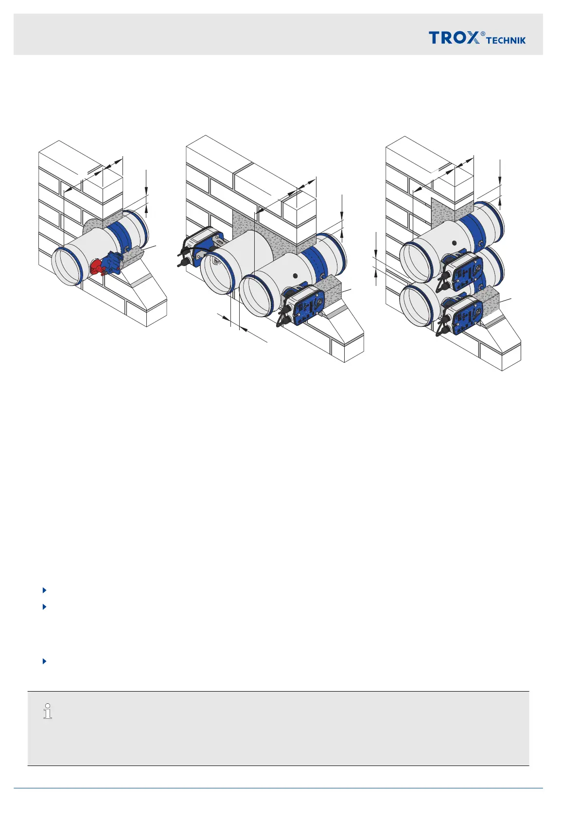 If the wall thickness is >115 mm , extend the fire damper on the installation side with an extension piece or a