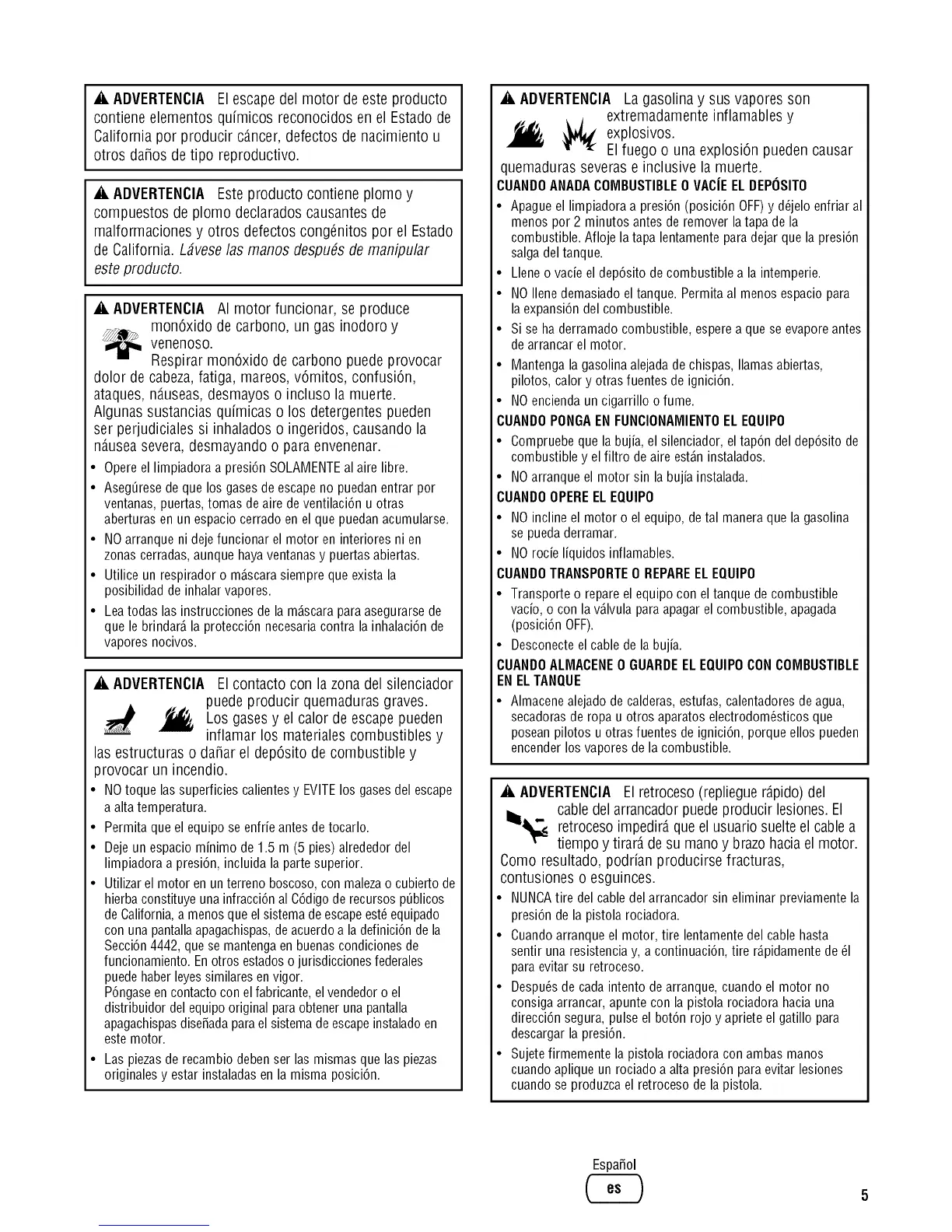 • NOarranque ni dejefuncionar el motor en interiores ni en