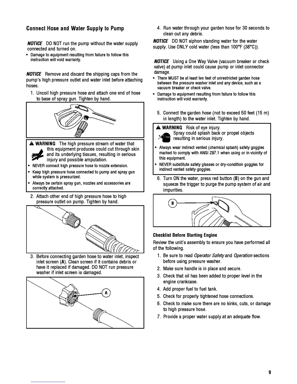 Troy-Bilt 020641 - Connect Hose and Water Supply to Pump; Checklist before Starting Engine