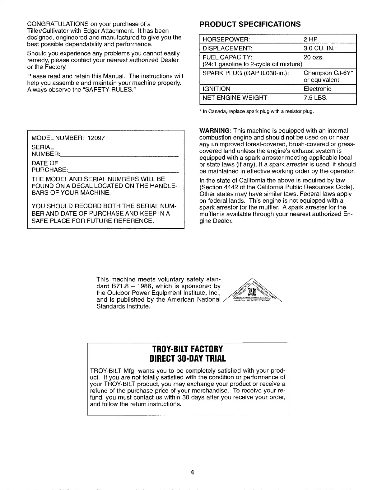 Troy-Bilt 12097 - PRODUCT SPECIFICATIONS; Model and Serial Number Recording