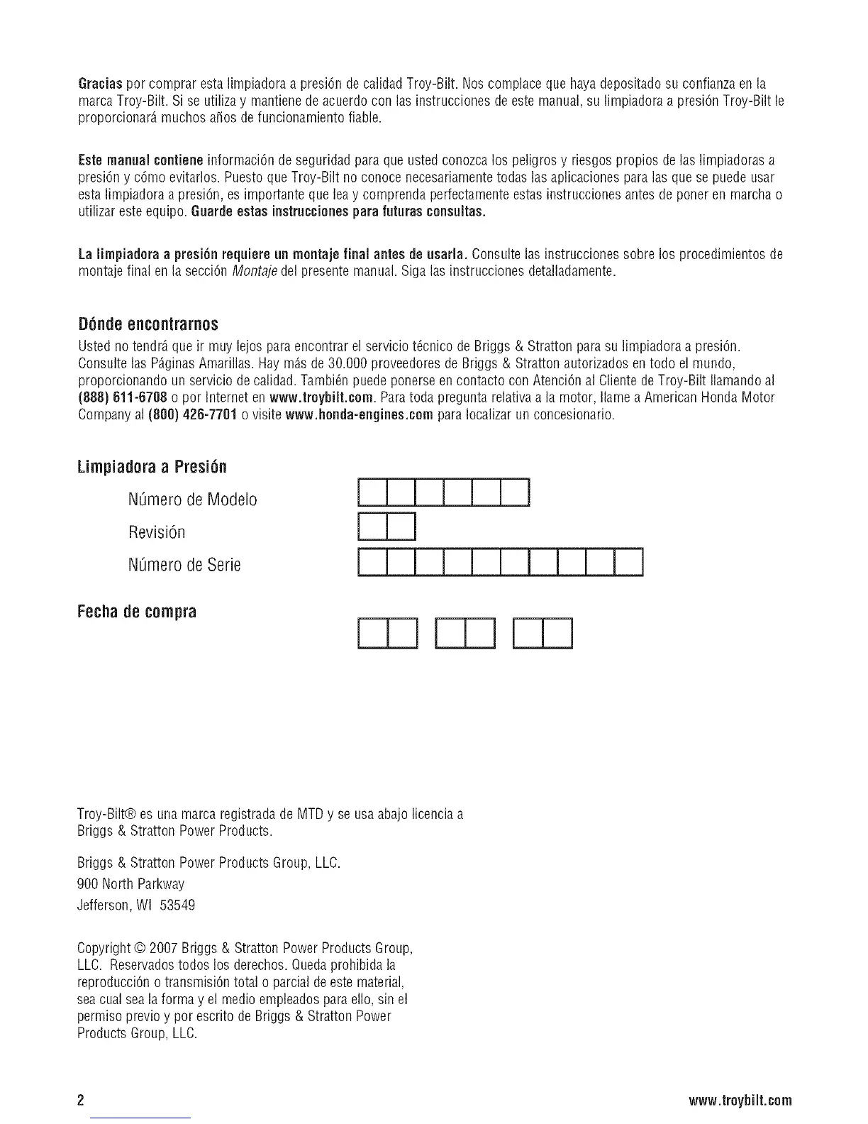 Graciasper comprar esta limpiadora a presi6n de calidad Troy-Bilt. Noscomplace que hayadepositadosu confianza en la