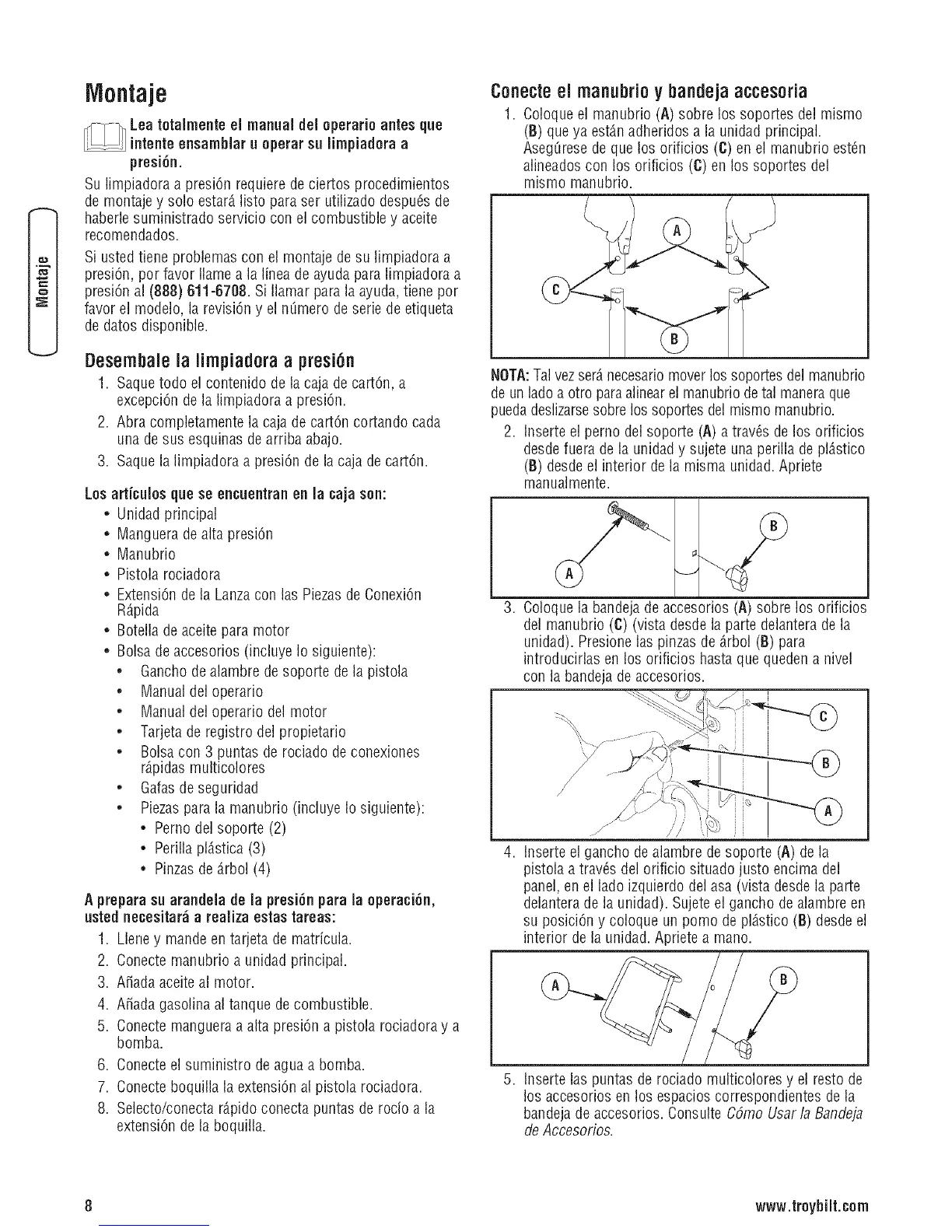 Aseg[iresede que los orificios (C) en el manubrio est6n