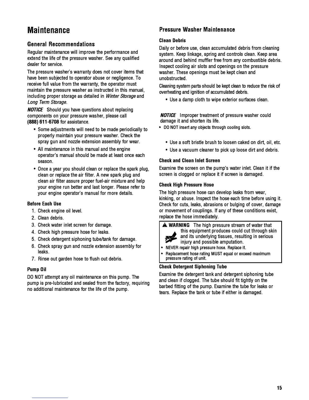 Troy-Bilt 20641 - Maintenance; General Recommendations; Before each Use; Pressure Washer Maintenance