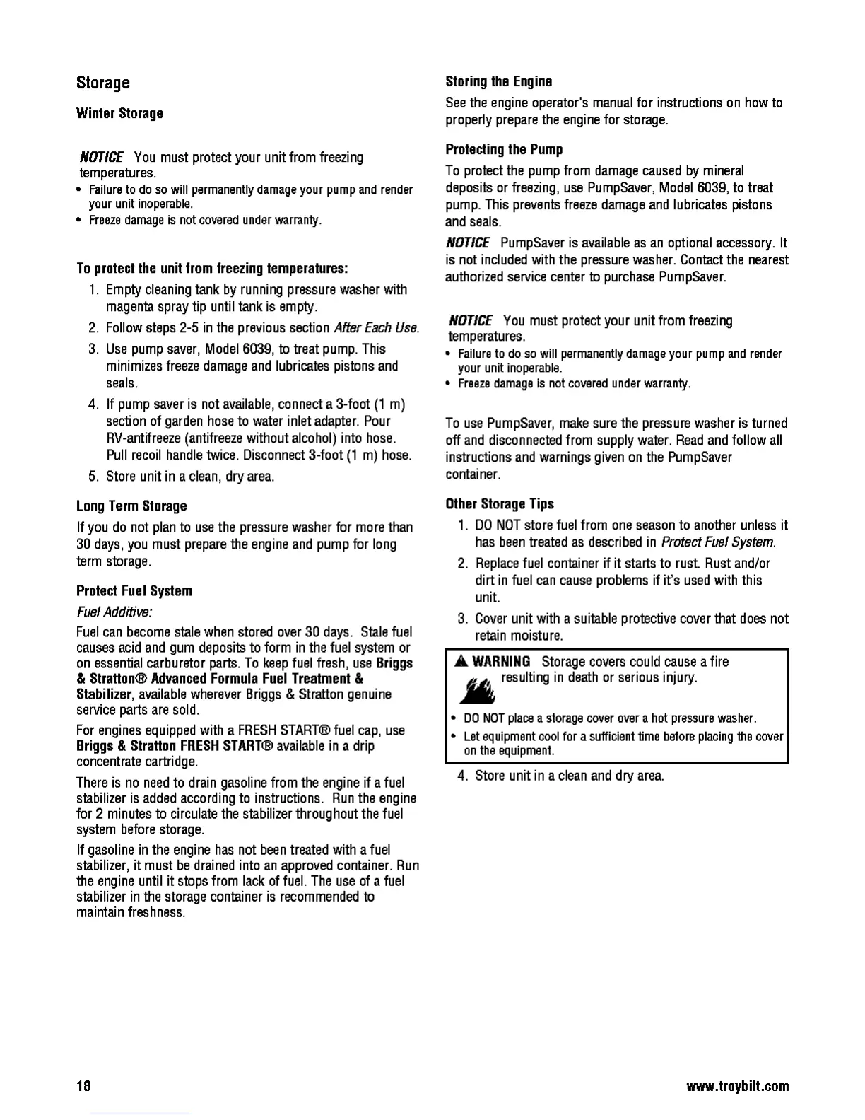 Troy-Bilt 20641 - Winter Storage; To Protect the Unit from Freezing Temperatures; Protect Fuel System; Protecting the Pump