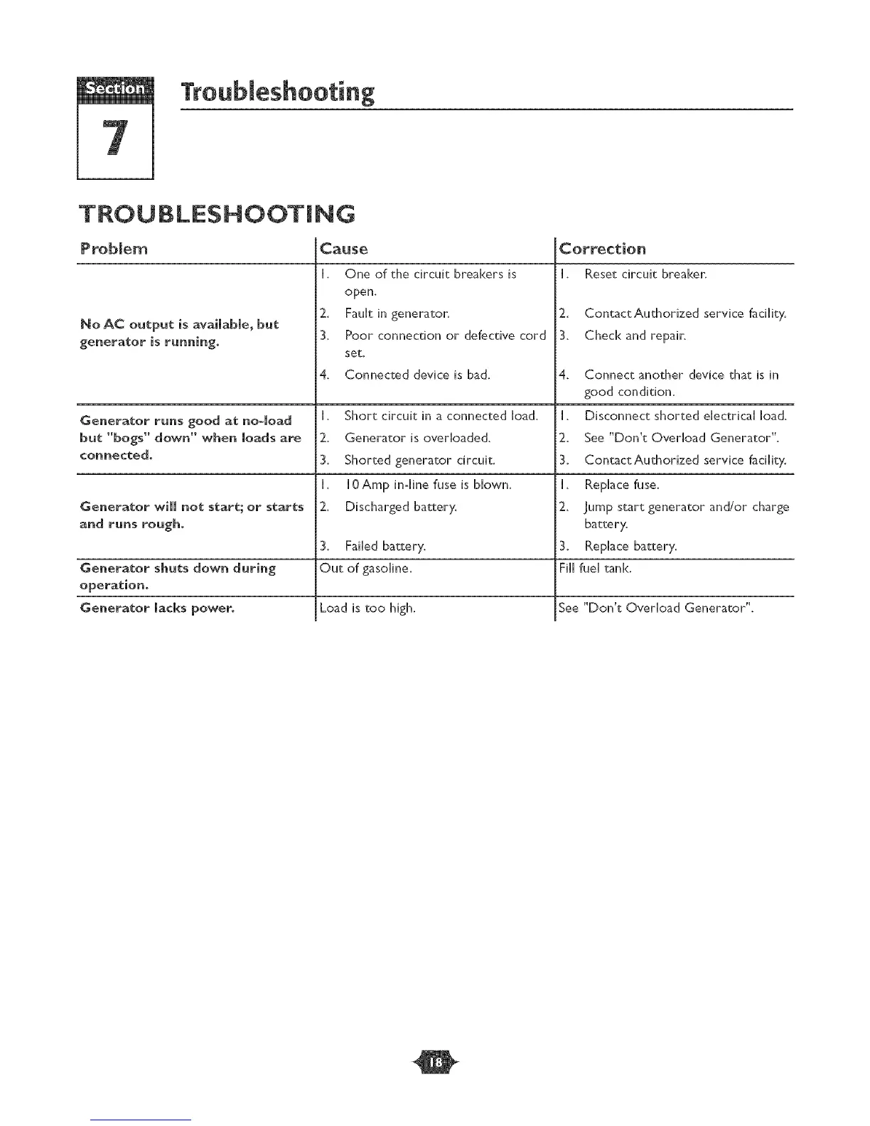 Generator lacks power. Load is too high. See "Don't Overload Generator".