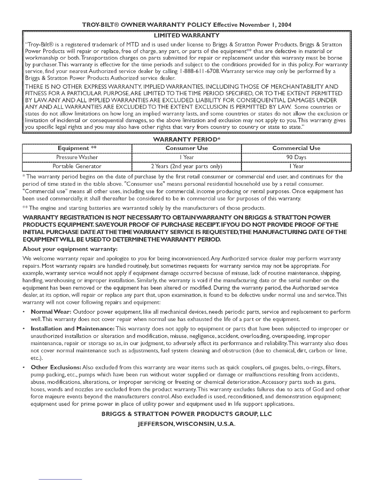 TROYoBILT®OWNERWARRANTYPOLICYEffectiveNovemberm,2004