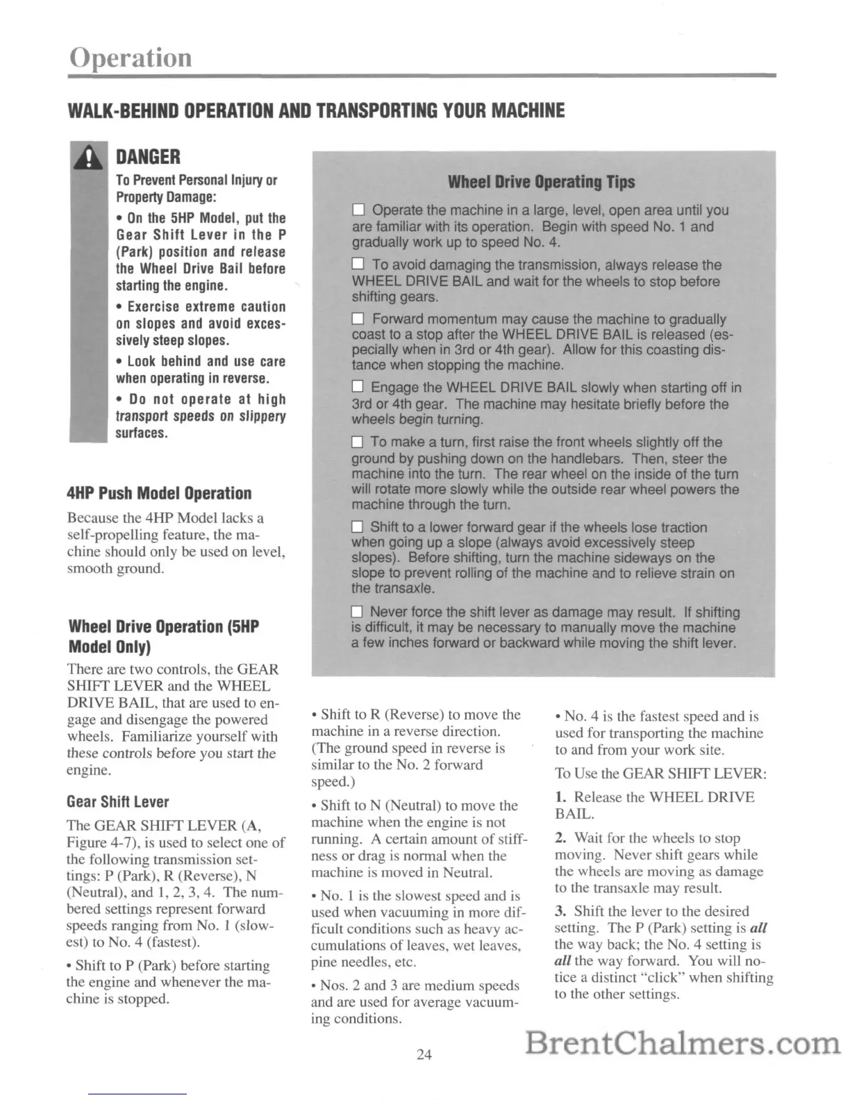 slopes). Before shifting, turn the machine sideways on the