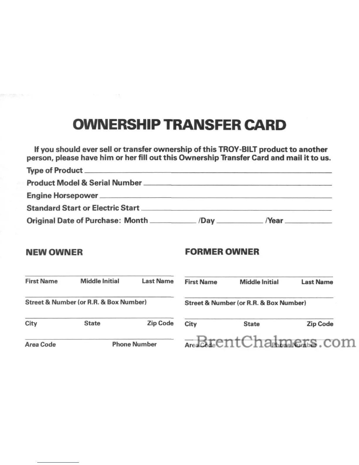 Troy-Bilt 47261 - Ownership Transfer Information; Ownership Transfer Card Form