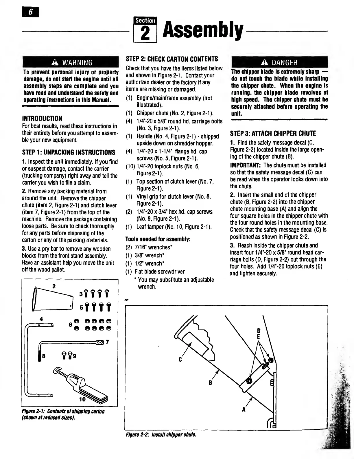 Troy-Bilt 47330 - Section 2 Assembly; Unpacking Instructions; Check Carton Contents; Attach Chipper Chute