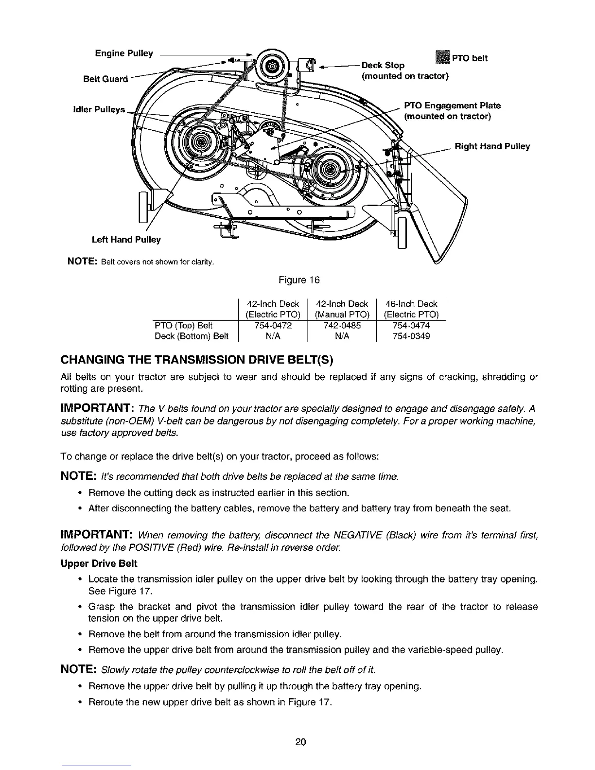 IMPORTANT: The V-belts found on your tractor are specially designed to engage and disengage safely. A
