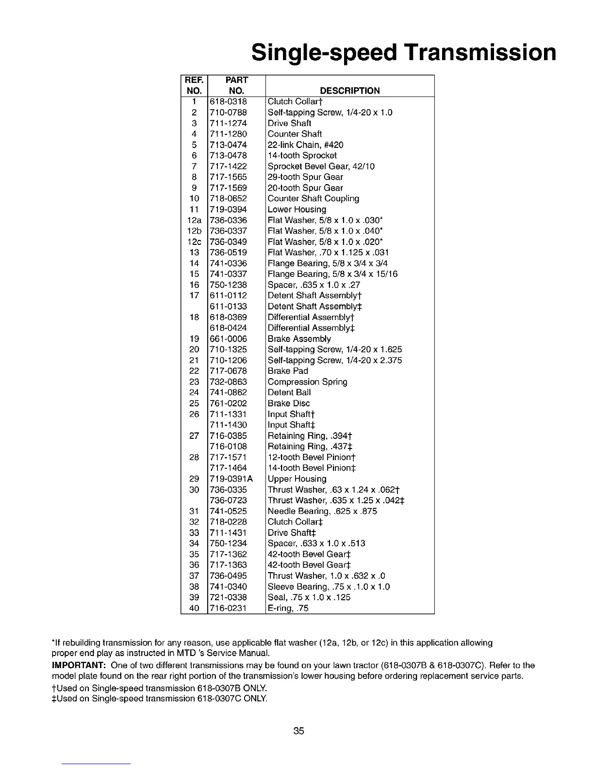 fUsed on Single-speed transmission 618-0307B ONLY.