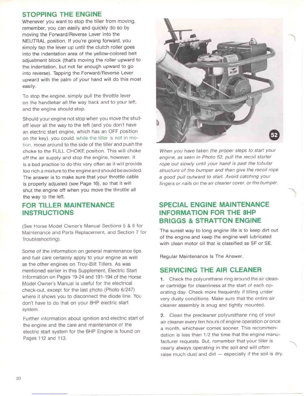 Troy-Bilt 8HP - STOPPING THE ENGINE; SPECIAL ENGINE MAINTENANCE INFORMATION FOR THE 8 HP BRIGGS & STRATTON ENGINE