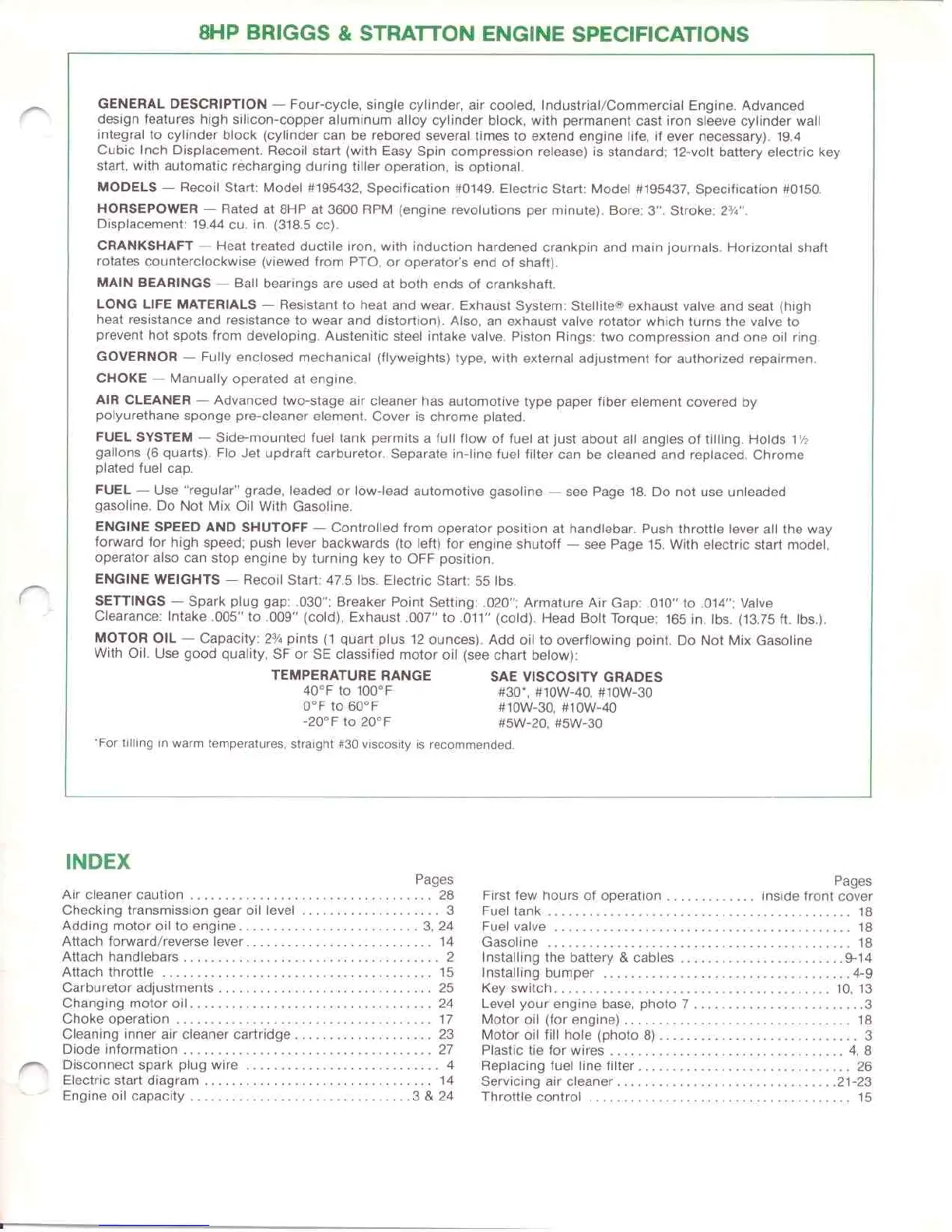Troy-Bilt 8HP - 8 HP Briggs & Stratton Engine Specifications; Index