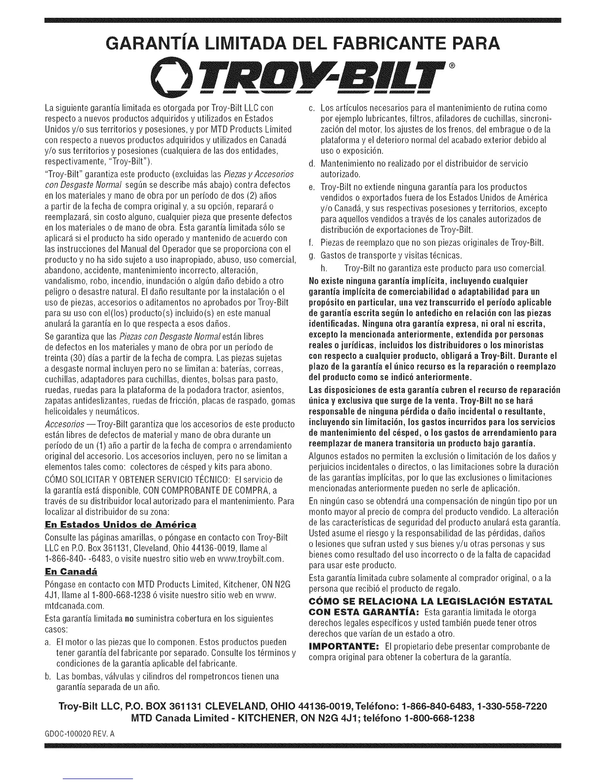 Troy-Bilt LLC, P.O. BOX 361131 CLEVELAND, OHiO 44136-0019, Tel_fono: 1=866-840=6483, 1-330-558-7220