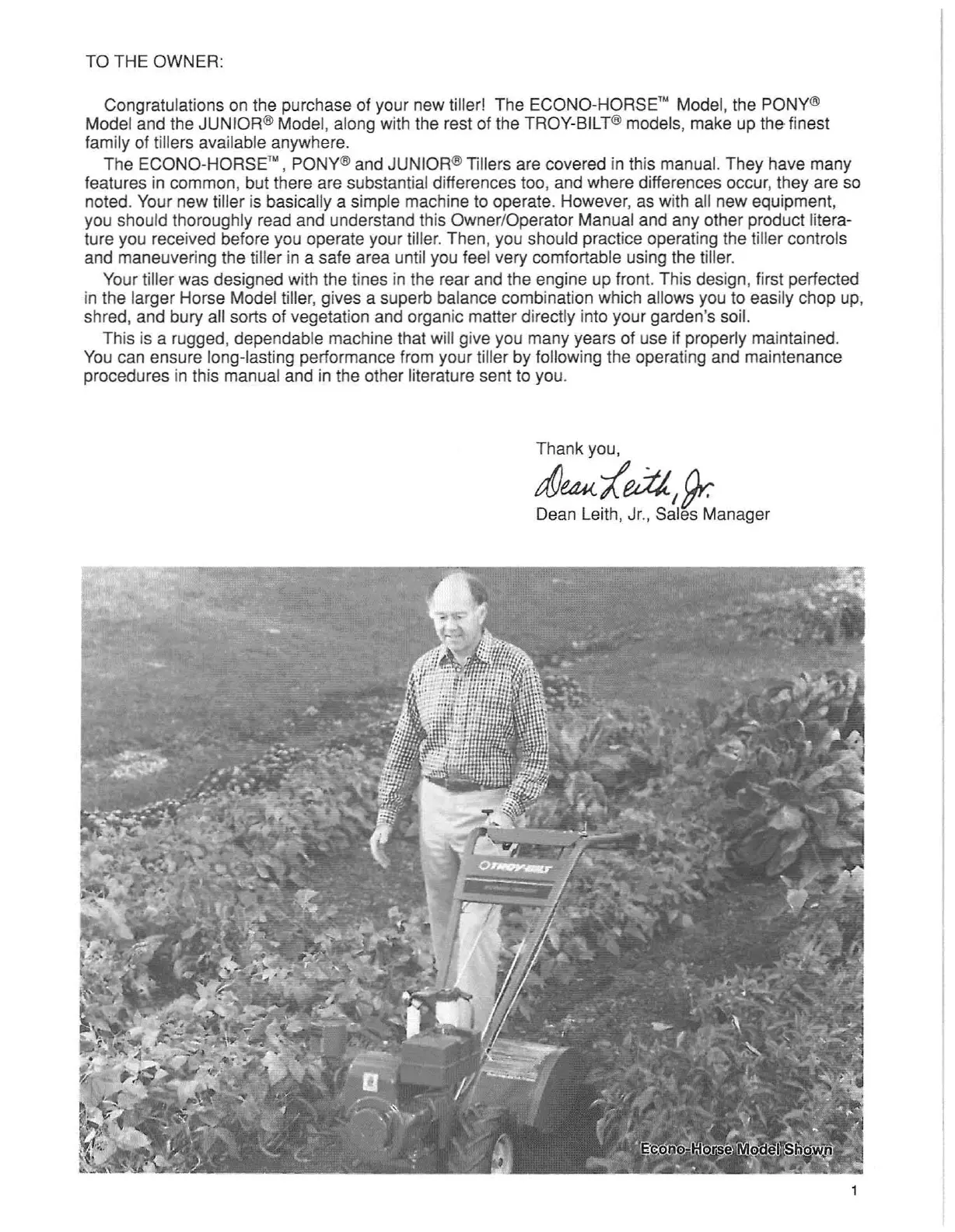 Congratulations on the purchase of your new tiller! The ECONO-HORSE'" Model, the PONY®