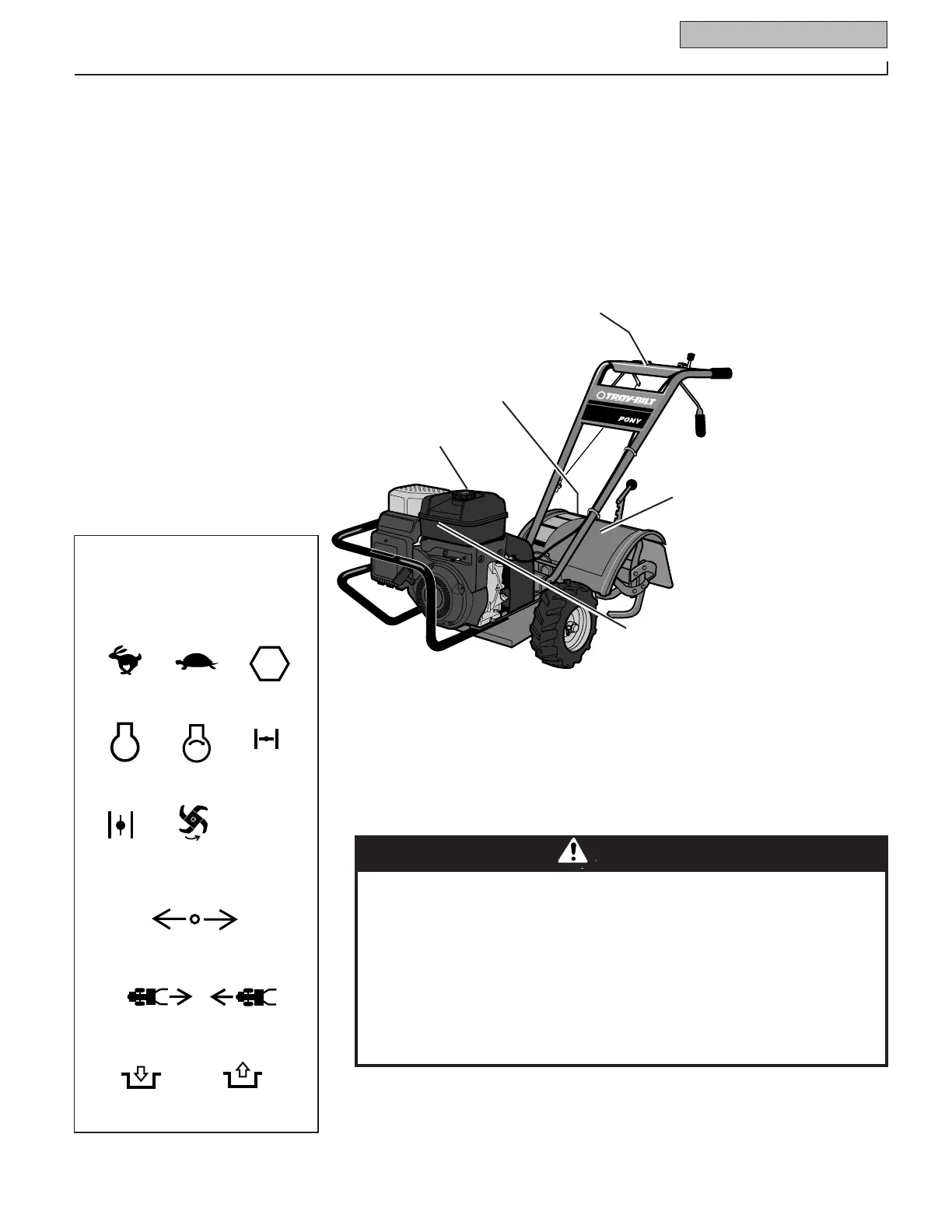• NEVER ALLOW CHILDREN OR UNINSTRUCTED ADULTS TO OPERATE TILLER.