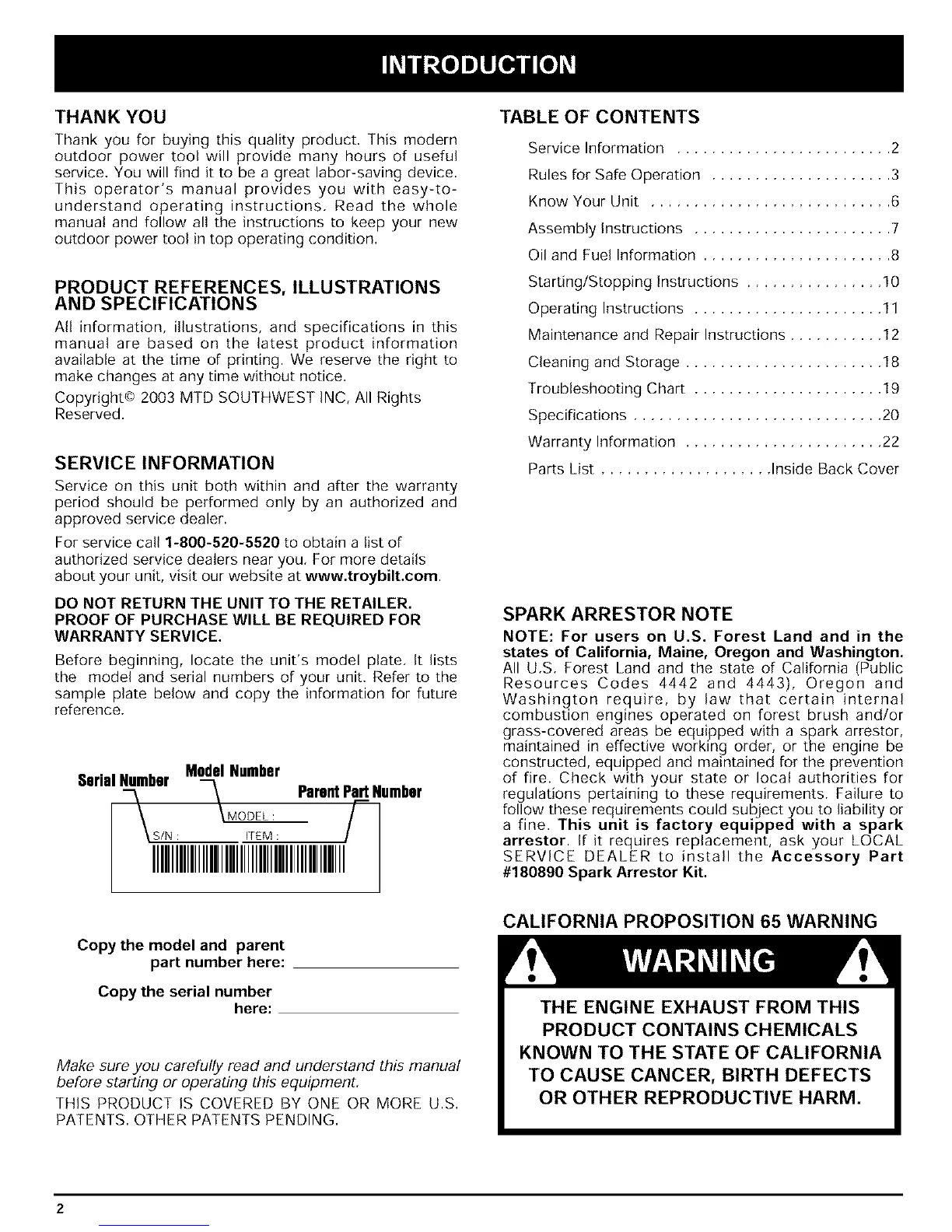 Copyright@ 2003 MTD SOUTHWEST INC, All Rights