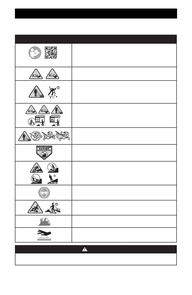 This page depicts and describes safety symbols that may appear on this mower. Read, understand, and follow all instructions on the