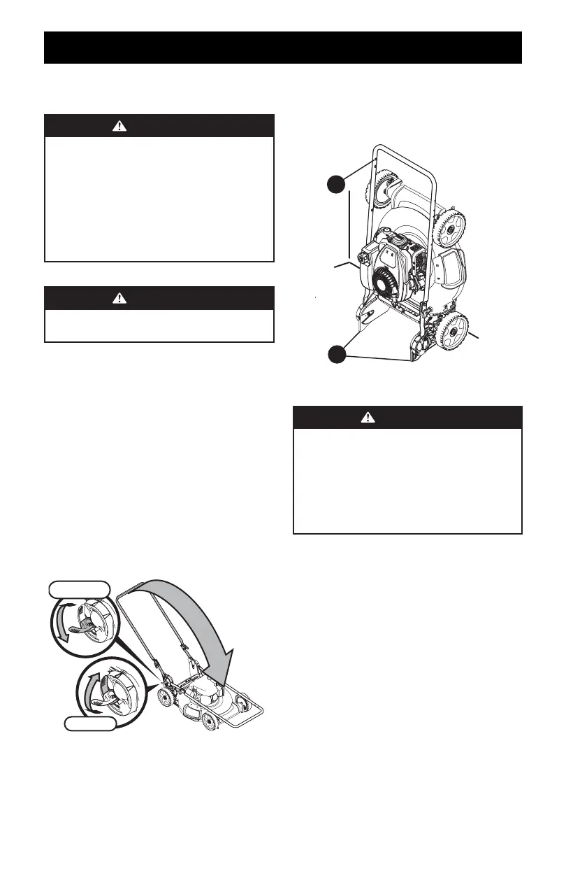 6. Tenez le guidon (a) et relevez la tondeuse pour qu’elle repose