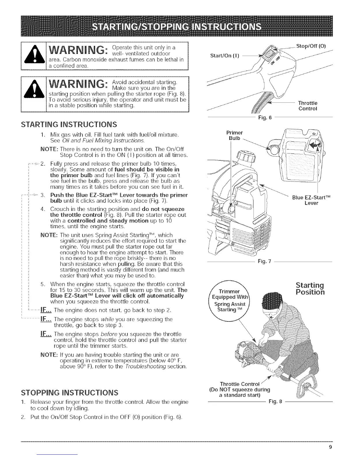 the throttle control (Fig. 8). Pull the starter rope out