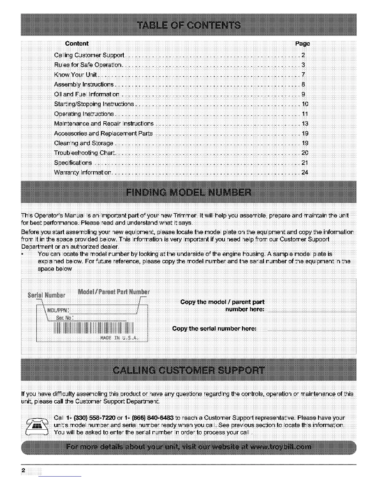 Troy-Bilt TB75SS - FINDING MODEL NUMBER; CALLING CUSTOMER SUPPORT