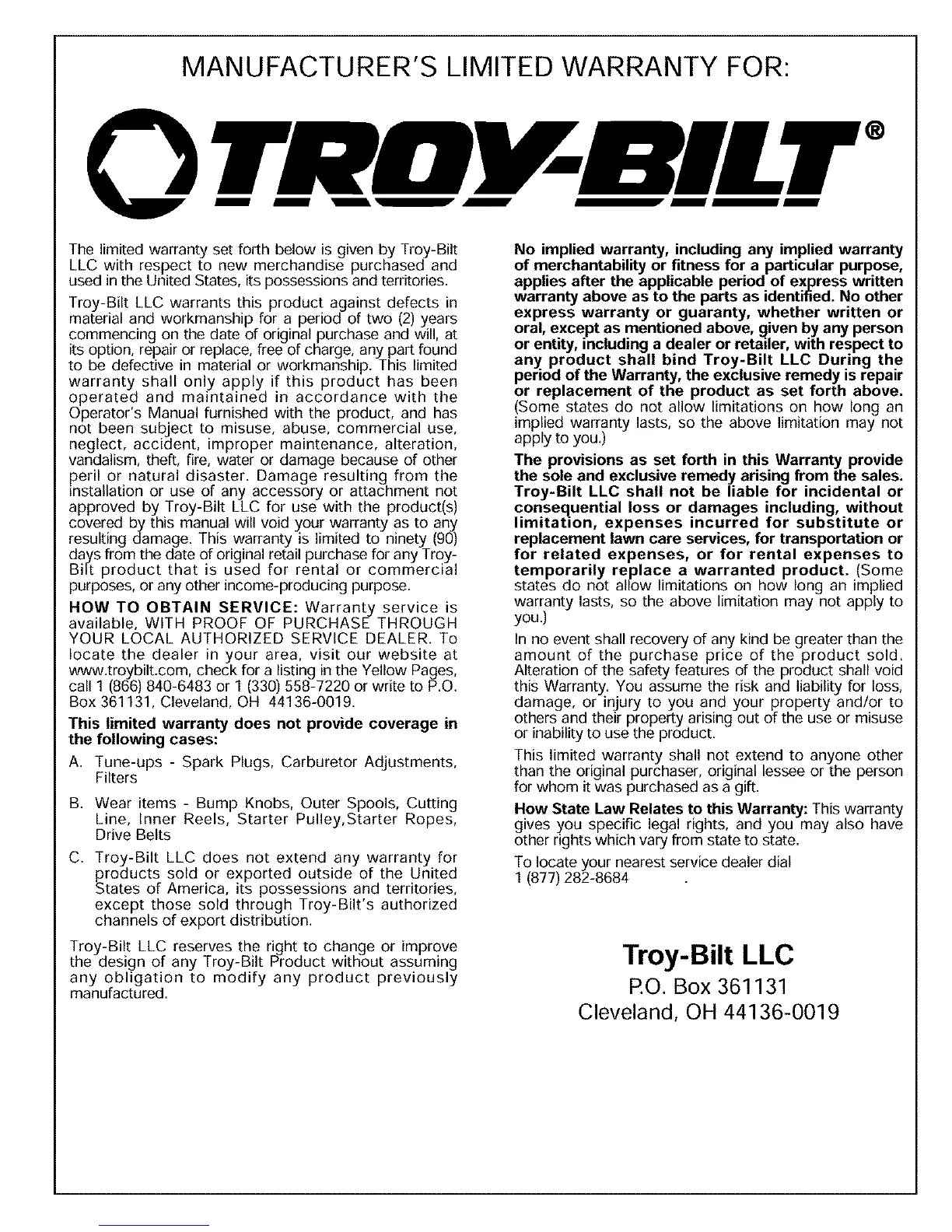 Troy-Bilt LLC shall not be liable for incidental or