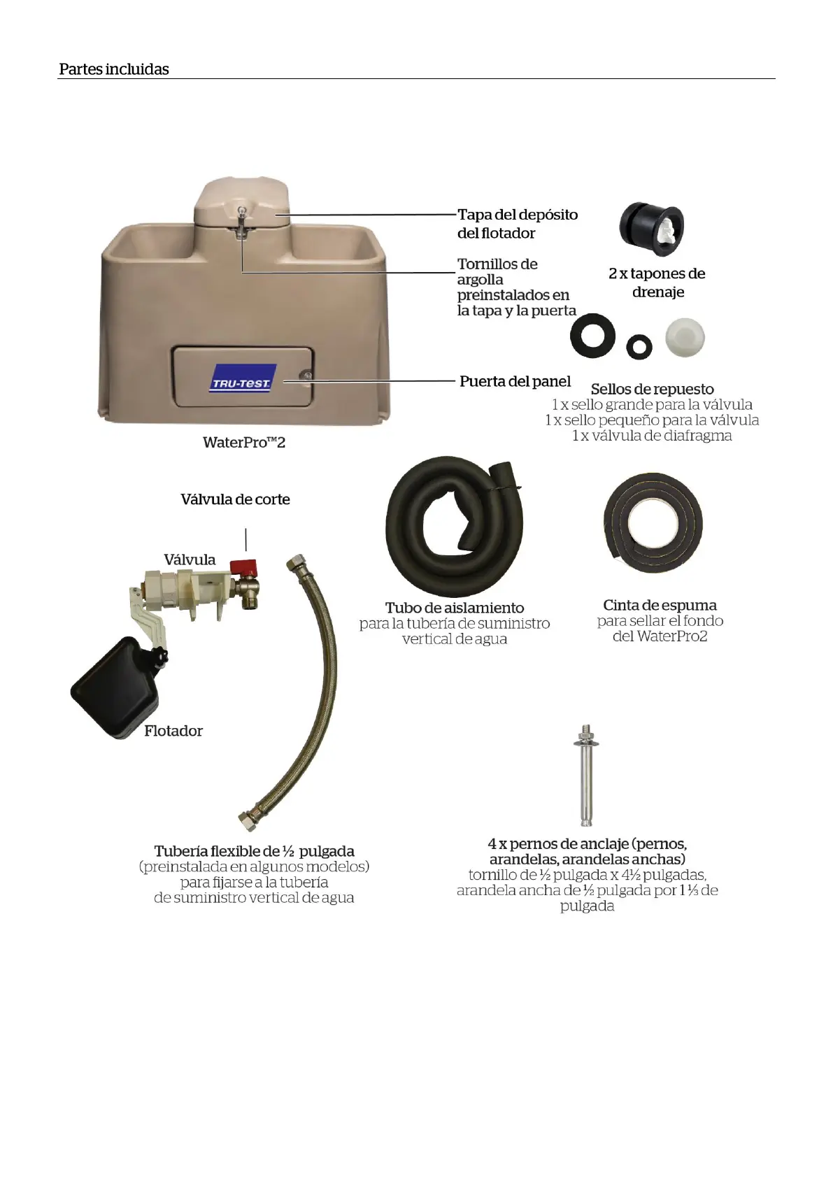 Familiarícese con las partes del WaterPro2 antes de instalarlo. En caso de que falte alguna parte, póngase en contacto con