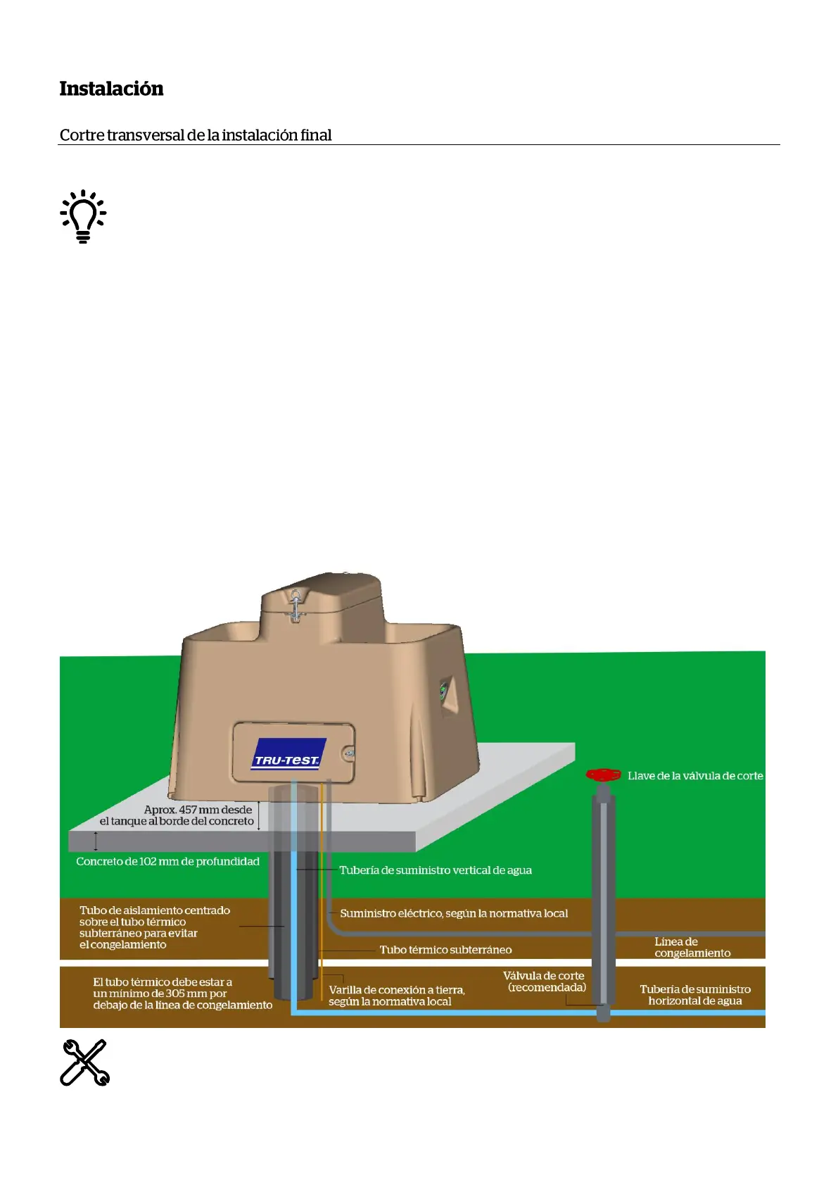 La losa de concreto debe tener al menos 102 mm de espesor y 457 mm del tanque al borde del concreto.