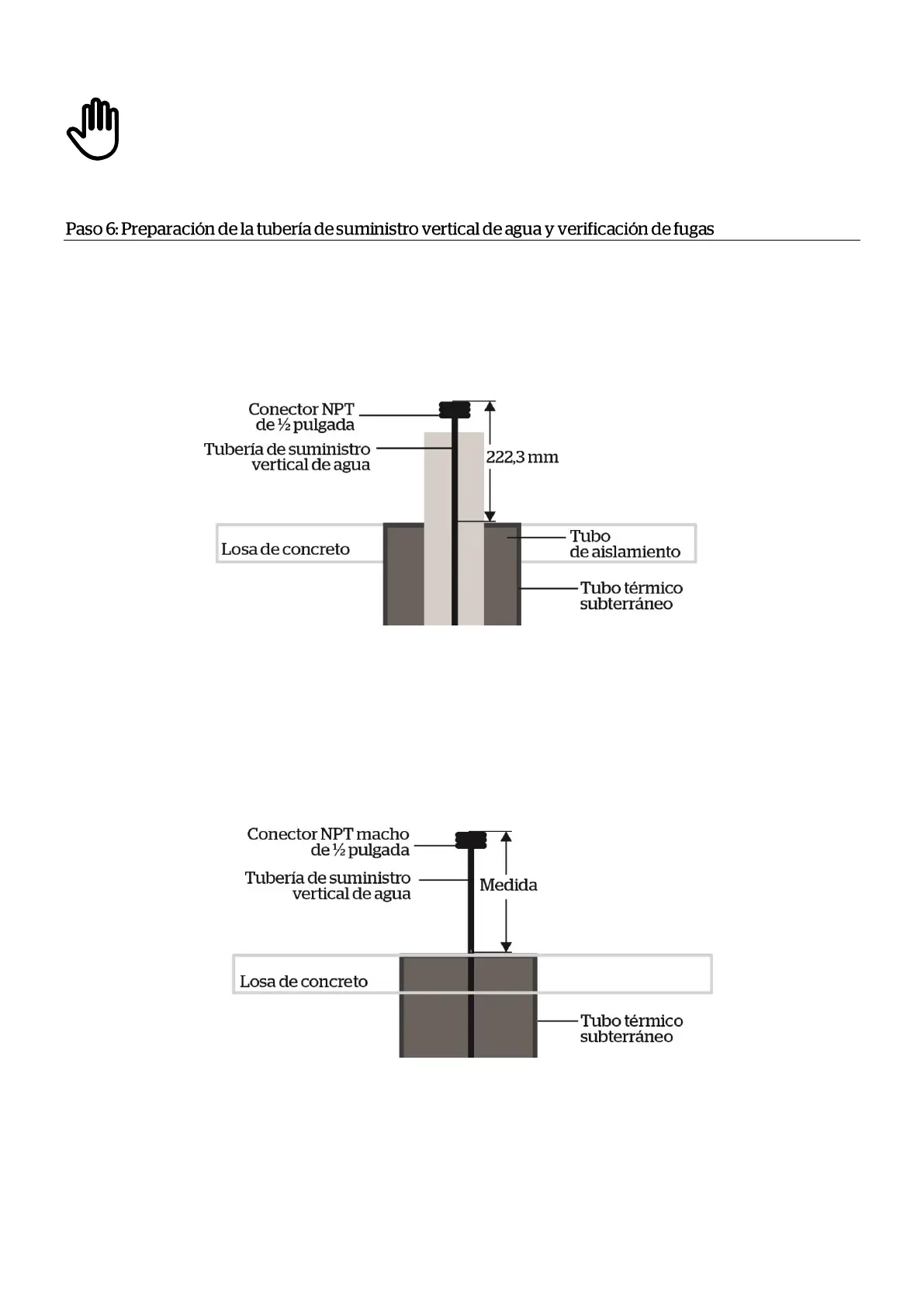 En el Paso 2, la tubería de suministro vertical de agua se cortó aproximadamente a 254 mm sobre la losa de concreto. En este