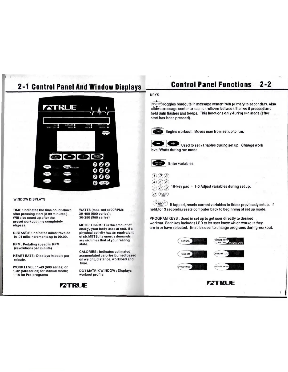 True 600 Series - Control Panel Overview; Control Panel Window Displays; Control Panel Functions and Keys