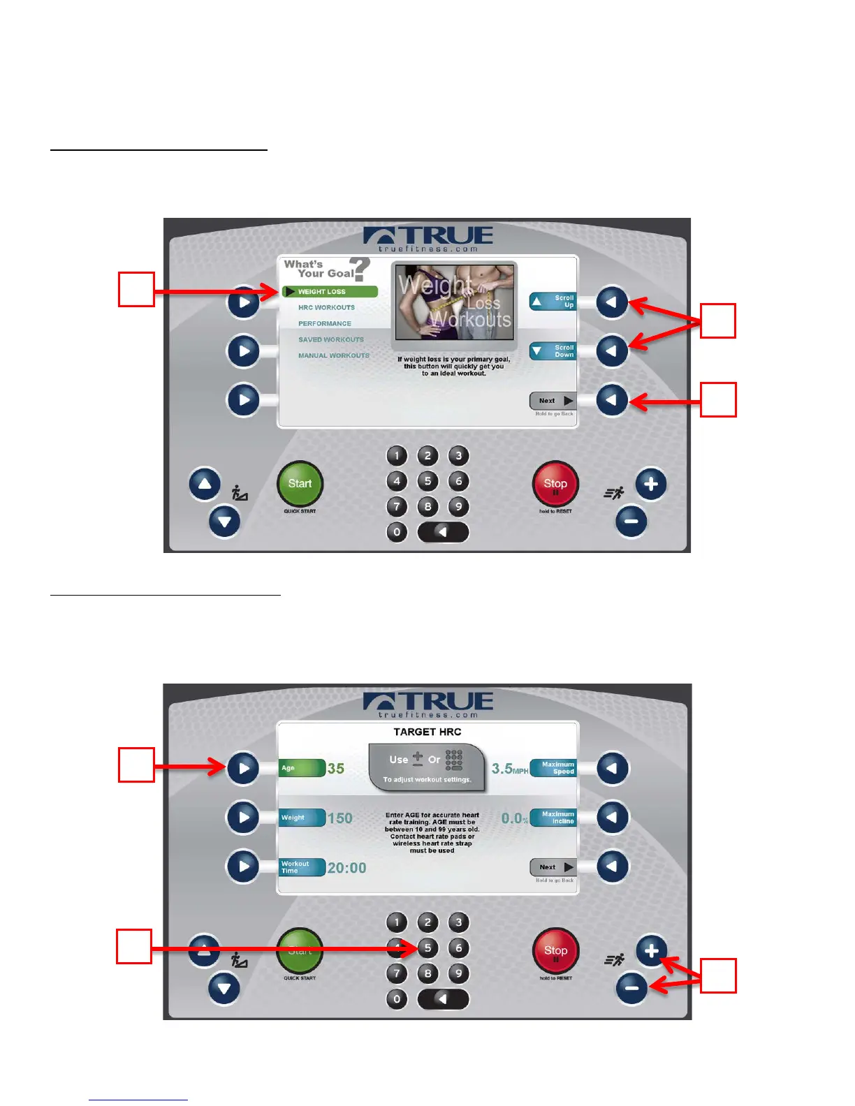 These screens allow users to input their personal information or workout goals prior to beginning a workout. To set a